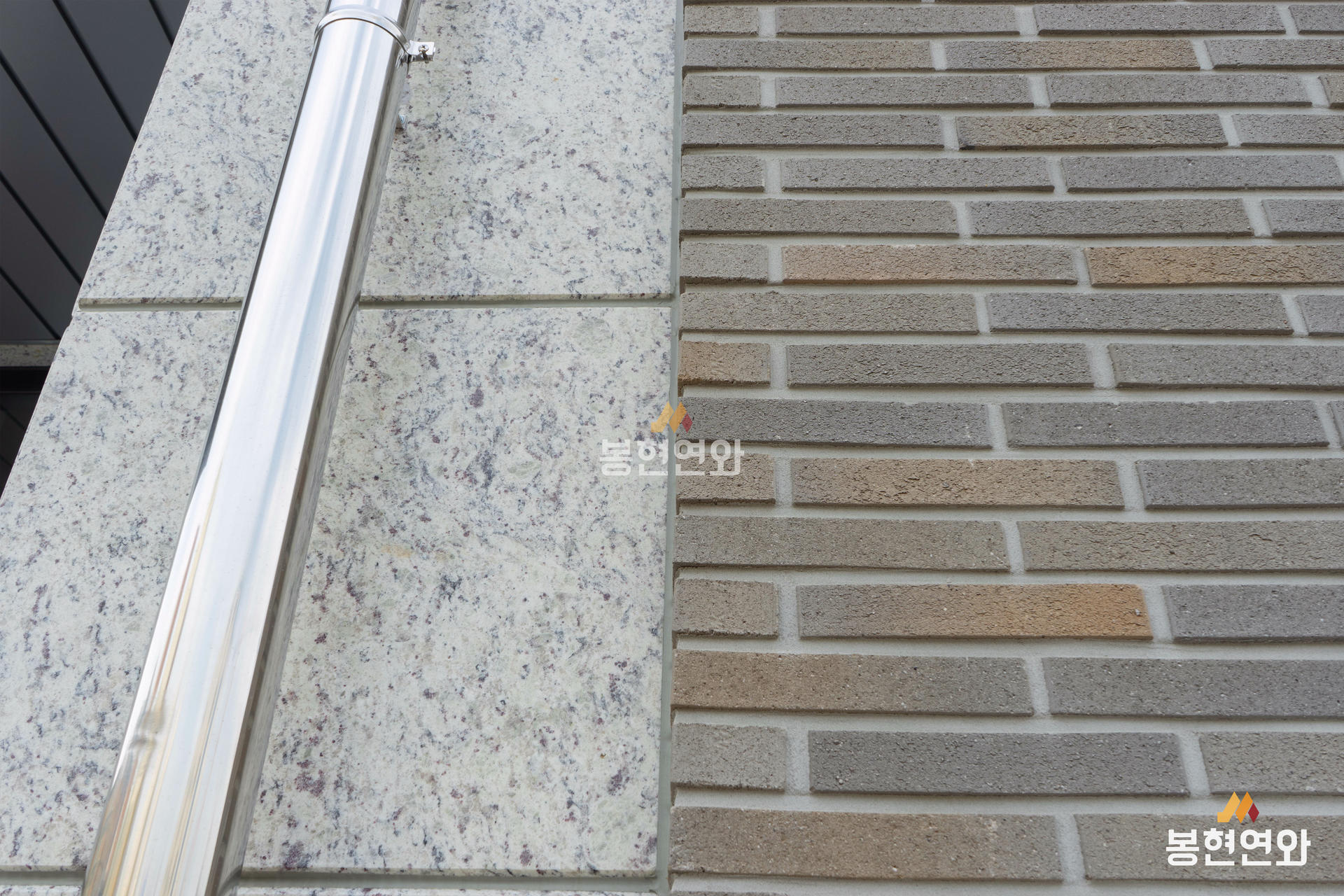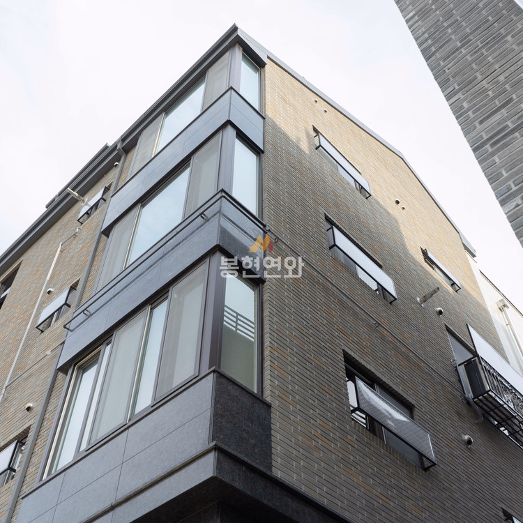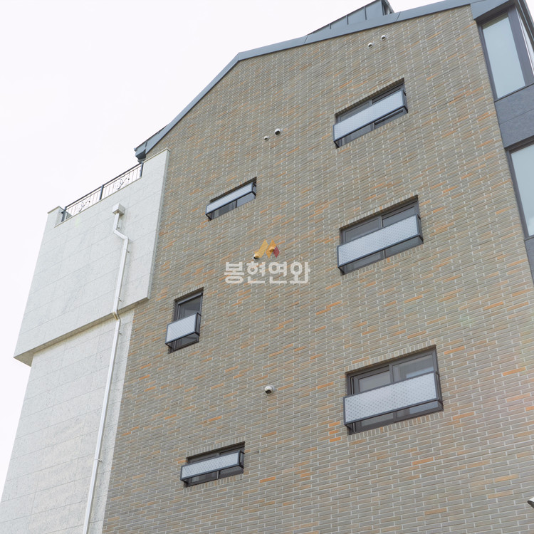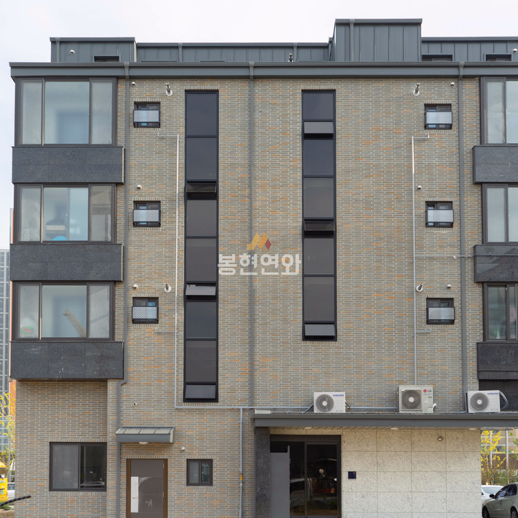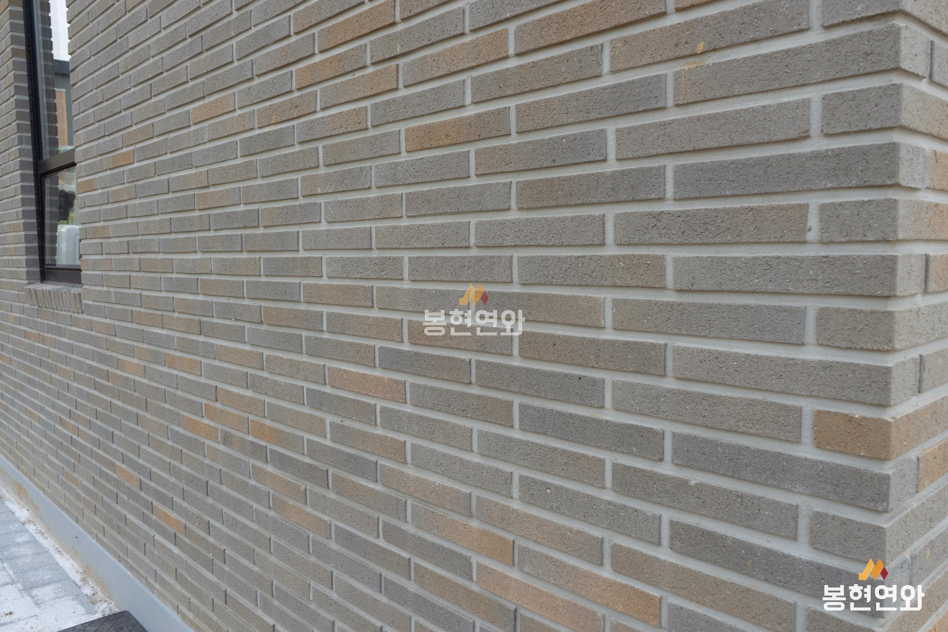 회색 전돌에 노란색 포인트가 자연스럽게 혼합된 고급벽돌이며, 롱슬림 사이즈 제품이 적용되어
